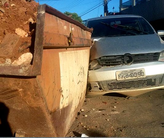 Veículo bate em caçamba depositada em rua no bairro Vila Nova