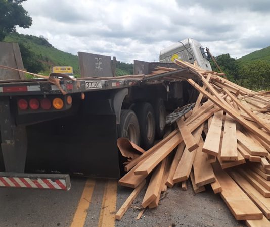 Região: Defeito em roda faz carga de carreta tombar na pista