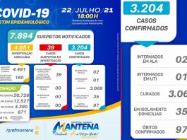 Covid/Mantena: Casos suspeitos em queda, ativos são 38