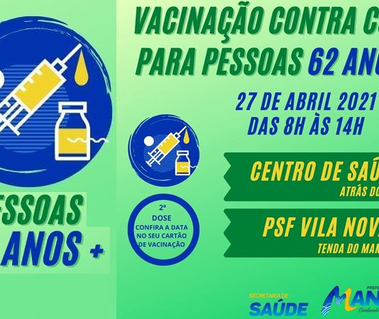 Covid/Mantena: Pessoas de 62 anos serão vacinadas nesta terça