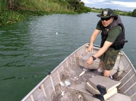 Rede de pesca é recolhida em lagoa pela PM Ambiental