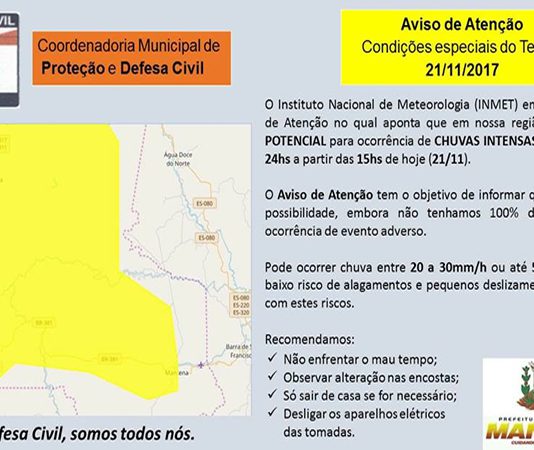 Defesa Civil de Mantena faz alerta para Chuvas Intensas