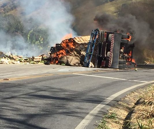 Caminhão tomba e pega fogo na Serra do Canivete
