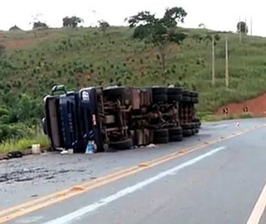 Motorista perde controle e caminhão tomba na rodovia