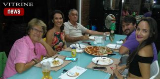 Nilo, Graça, filho, nora e amiga Ieié na Pizzaria Dona Olga