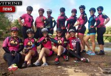 Meninas do pedal abraçando a campanha Outubro Rosa