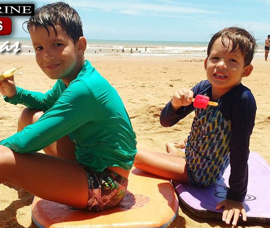 Irmãos pegando onda em Guriri, garotada no Bodyboard