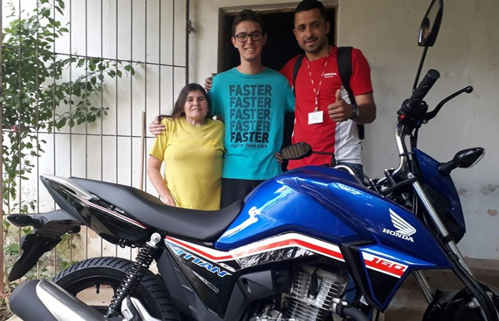 Ele na foto ao lado do cliente e amigo Vitor Alves, que adquiriu uma bela Honda Titan 160. Com certeza mais um cliente satisfeito, realizando o sonho de uma moto novinha, parabéns.