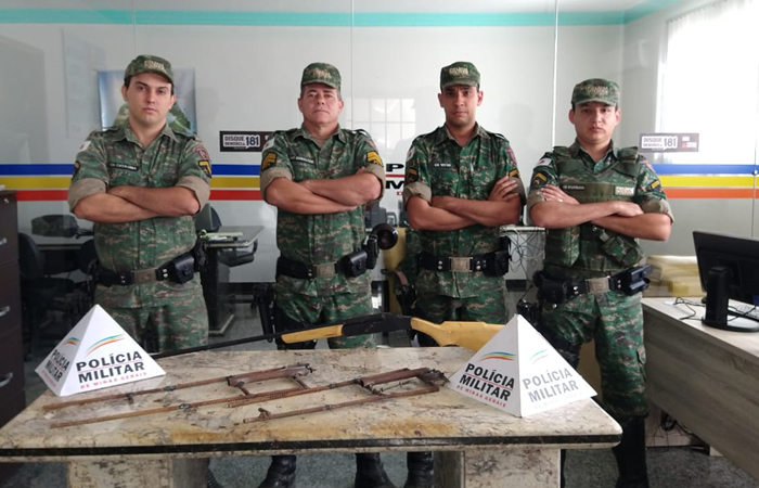 Após as informações os policiais verificaram o interior de uma propriedade rural localizada no córrego São Felix e após uma busca minuciosa logramos êxito apreendendo Armas de fogo de fabricação artesanal; espingarda cal 32 e ainda 02 canhões usados para disparo de munições em trilhas de animais silvestres. (fonte/foto:PMMG).