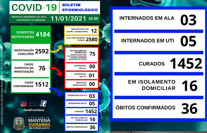 O boletim epidemiológico sobre o Covid 19 no município de Mantena, divulgado na tarde desta segunda-feira dia 11 de Janeiro, trás novamente informações importantes sobre a doença, e infelizmente o registro de 36 mortes confirmadas em Mantena, desde o início da Pandemia.